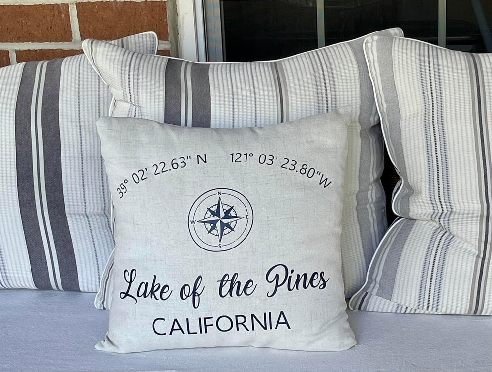 Bring home a touch charm with this beautifully designed coordinate pillow, featuring precise coordinates and a classic compass graphic. Perfect for porches, living rooms, or vacation homes, it adds a personalized and stylish reminder of your favorite place. These pillows are custom made to your request. Send us a message in the Contact us page with details.