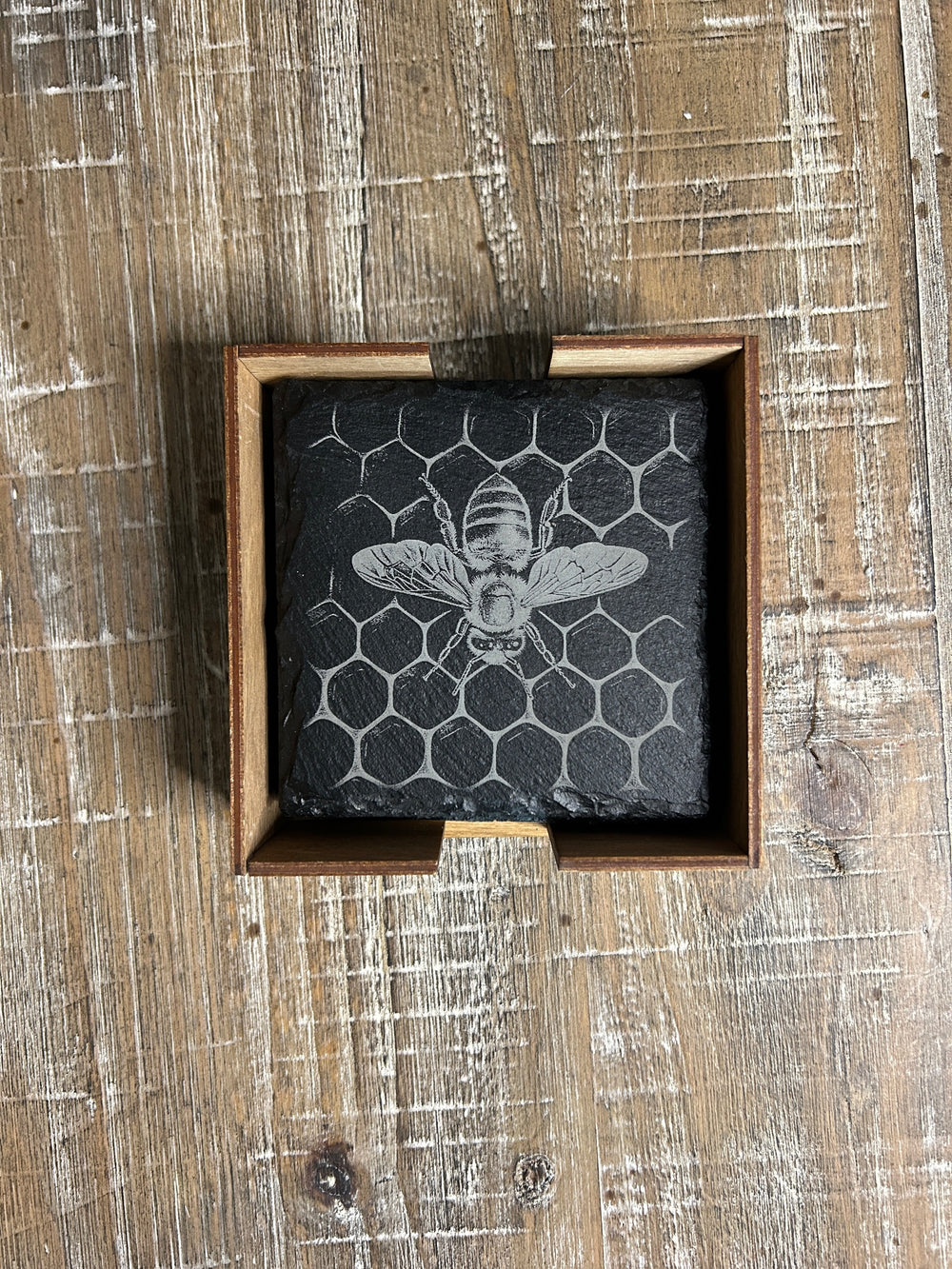 Celebrate the beauty of nature with this handcrafted set of laser-engraved slate coasters, each featuring a detailed bee-themed design. From honeycomb patterns to floral scenes, every coaster brings a touch of rustic charm and artistry to your home. Set of 4 (Randomly chosen designs) includes custom stained birch box.